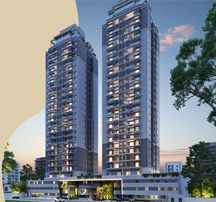Projeto composto de duas torres, com 22 lajes tipo compostas de 4 apartamentos por andar.